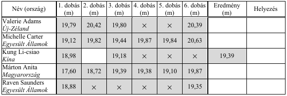 A 2016-os nyári olimpiai játékok női súlylökés versenyszámának döntője alapján készült az alábbi, hiányosan kitöltött táblázat, amely az első öt helyezett dobásainak hosszát mutatja. Egy adott versenyző eredménye az érvényes dobásai közül a legnagyobb. A táblázatban az × az érvénytelen dobást jelzi.