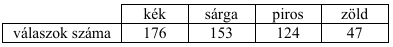Egy textilgyár felmérést készített, hogy a vásárlói igényeknek megfelelő arányban gyárthassa le törölközőit. Megkérdeztek 500 járókelőt arról, hogy négy lehetséges szín közül melyik színben vásárolnának legszívesebben ilyen törölközőt. Az alábbi táblázatban látható a felmérés eredménye.
