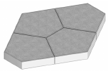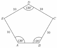 Egy sétálóutca díszburkolatát ötszög alapú egyenes hasáb alakú kövekkel készítik el. (Az ábrán négy ilyen követ lehet látni a burkolaton megfigyelhető elrendezésben.) A kő alapját képező $ ABCDE $ ötszög tengelyesen szimmetrikus (egy, a $ D $ csúcson átmenő egyenesre), négy oldala $ 10 cm $ hosszú, három szöge $ 120\sphericalangle $-os, az ábrának megfelelően.