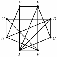 Egy nyolccsapatos jégkorongbajnokságban minden csapat minden másikkal egyszer mérkőzik meg. Az ábrán látható gráf az eddig lejátszott mérkőzéseket szemlélteti. A pontok a csapatokat jelképezik, és két pont között pontosan akkor van él, ha a két csapat már játszott egymással. A bajnokságból 5 fordulót már megrendeztek, ám néhány mérkőzés elmaradt. (Egy fordulóban – ha nincs elmaradó mérkőzés – mindegyik csapat egy mérkőzést játszik.) a) Adja meg három olyan csapat betűjelét, melyek közül bármely kettő már lejátszotta az egymás közötti mérkőzését! b) Hány mérkőzés maradt el az első 5 fordulóban? Az egyik játékos 0,3 valószínűséggel szerez gólt egy büntetőlövésből. c) Mekkora a valószínűsége, hogy 10 büntetőlövésből pontosan 4 gólt szerez? A szabványos jégkorong egy olyan vulkanizált gumihenger, amelynek magassága 2,54 cm (1 inch), alapkörének átmérője 7,62 cm (3 inch). Az egyik csapat a pálya bejáratához egy olyan nagyméretű korongot terveztet, amely (matematikai értelemben) hasonló a szabványos jégkoronghoz. A tervben szereplő nagyméretű korong térfogata 1 m 3.
