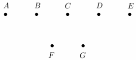 Az ábrán szereplő $ A, B, C, D $ és $ E $ pontok egy olyan egyenesre illeszkednek, amely párhuzamos az $ F $ és $ G $ pontokra illeszkedő egyenessel.