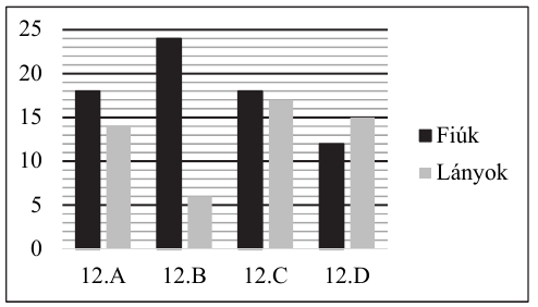 Az ábrán látható diagram egy végzős évfolyam négy osztályában mutatja a fiúk és a lányok számát.