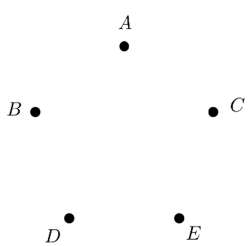 A vázlatos ábra egy szántóföld felosztását mutatja az öt tulajdonos között. Szeretnénk elkészíteni a szántóföldhöz tartozó szomszédsági gráfot, amelyben két csúcs pontosan akkor van összekötve éllel, ha a két csúcs által jelölt földterület szomszédos. (Két földterület szomszédos, ha van közös határolószakasza.)