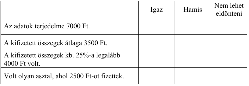 c)Az alábbi kijelentések a fenti diagramon ábrázolt adatokra vonatkoznak. Állapítsa meg minden kijelentésről, hogy igaz, hamis, vagy az adatok alapján ezt nem lehet eldönteni! Tegyen X-et a megfelelő cellába! Válaszait itt nem kell indokolnia.  Az alábbi kijelentések a fenti diagramon ábrázolt adatokra vonatkoznak. Állapítsa meg minden kijelentésről, hogy igaz, hamis, vagy az adatok alapján ezt nem lehet eldönteni! Tegyen X-et a megfelelő cellába! Válaszait itt nem kell indokolnia.)