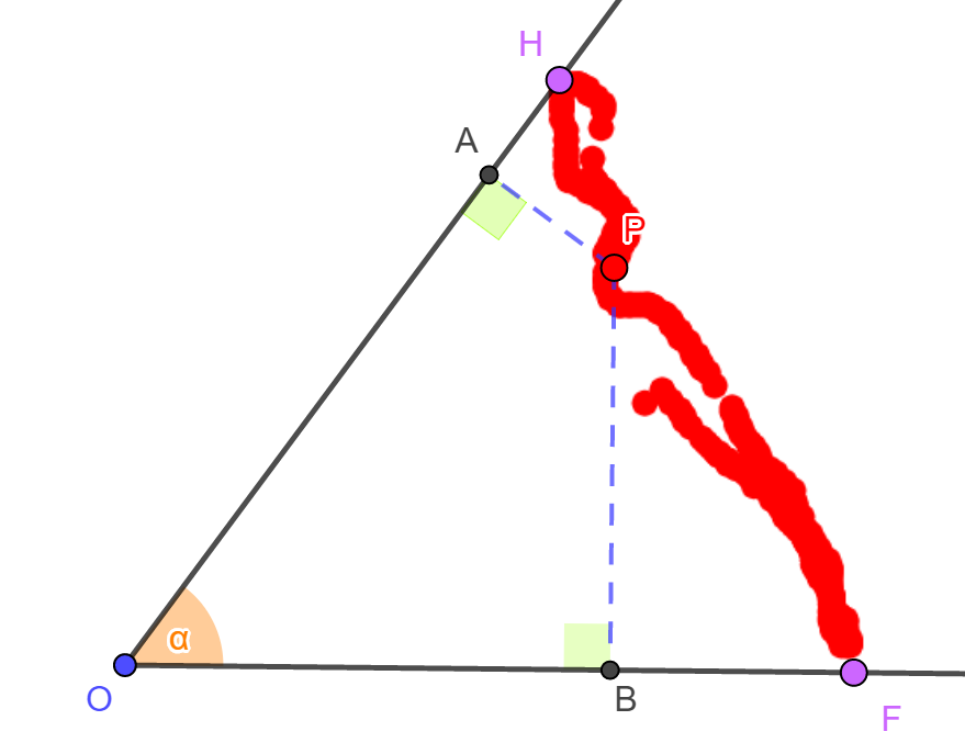 Állításunk megfordítása is igaz. Ha a HF szakasz egy P pontját tekintjük, akkor annak távolsága a g' és f szögszáraktól egyenlő, és így az szög száraitól mért távolságösszege éppen az adott a állandó.