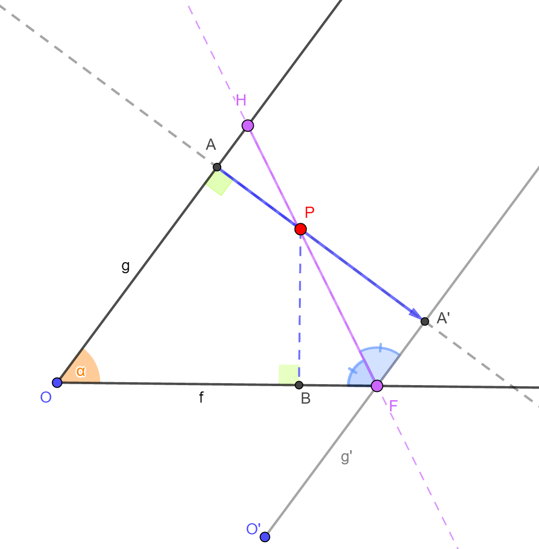 amit ha összevetünk a feltétellel, akkor azt kapjuk, hogy . Ez azt jelenti, hogy P illeszkedik az f és g' szögszárak által határolt megfelelő szögtartomány szögfelezőjére (az ábrán az ). Ha a szögfelező a g szögszárat H-ban metszi, akkor tekintettel arra, hogy P az szögtartomány pontja, P a HF szakaszra illeszkedik.