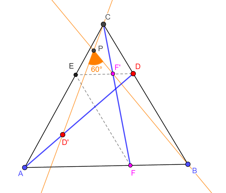 háromszög AB, BC, valamint CA oldalán az F, D, valamint E pontokat úgy,
