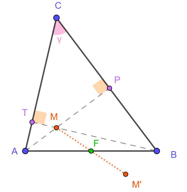 A hegyesszögű ABC háromszög M magasságpontját tükrözzük AB oldalának F felezőpontjára! Szerkesszük meg az ABC háromszög köré írható kört! Mit tapasztalunk? Igazoljuk sejtéseinket! Vizsgáljuk meg, hogy igazak maradnak-e a sejtések, ha az ABC háromszög már nem hegyesszögű!