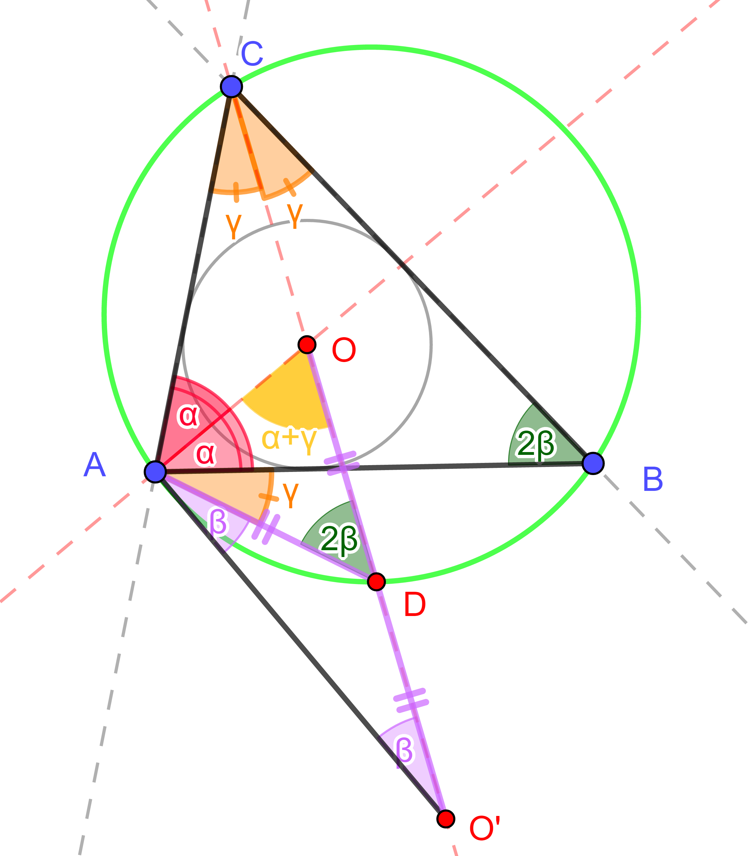 szögfelezőire illeszkednek, ezért az ACO háromszögben és , így a háromszög O csúcsnál lévő