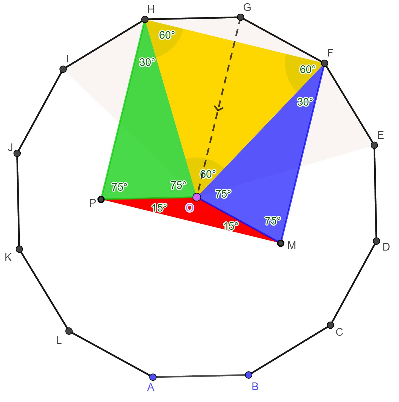 a szabályos 12-szög egy belső szöge 150°, ezért a GHF