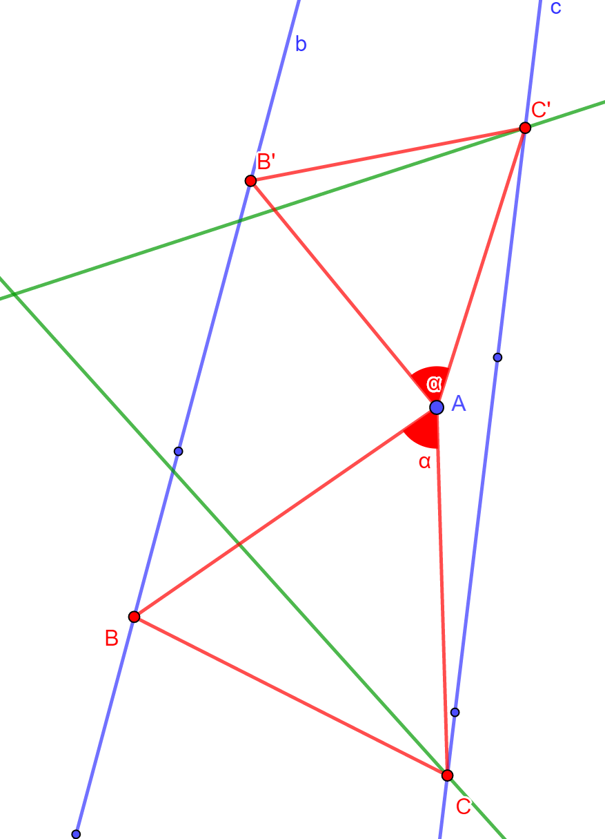 3. lépés: Forgassuk el a 2. lépésben kapott C (C') pontot az A csúcs körül szöggel