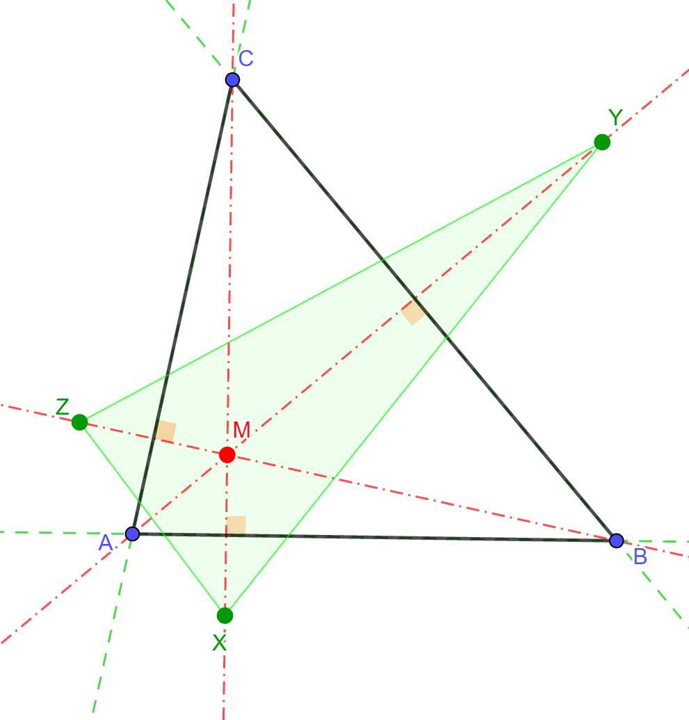 A hegyesszögű ABC háromszög M magasságpontját tükrözzük a háromszög AB, BC, CA oldalegyeneseire, a tükörképek rendre X, Y és Z. - Szerkesszük meg az XYZ háromszög köré írható kört. Mit tapasztalunk? Magyarázzuk meg a látottakat!