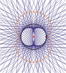 epiciklois002 feladatKészítsünk animációt egy adott körön kívülről végiggördülő kör megjelenítésére, ha a rögzített, valamint a gördülő körök sugarának aránya 2:1! Vizsgáljuk meg, hogy milyen pályát ír le a gördülő kör egy rögzített küllőjének belső, illetve „külső” pontja a mozgás során!