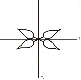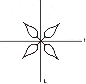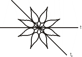 F2.: Az egymásra merőleges egyenesek most is a tükrök helyét jelölik. Az egyik tükörbe nézünk bele – mindegy melyikbe? – abból a mezőből, ahol a szirom található. Mit fogunk látni?